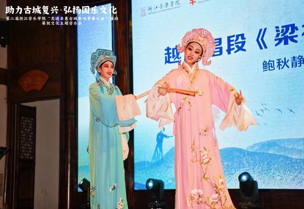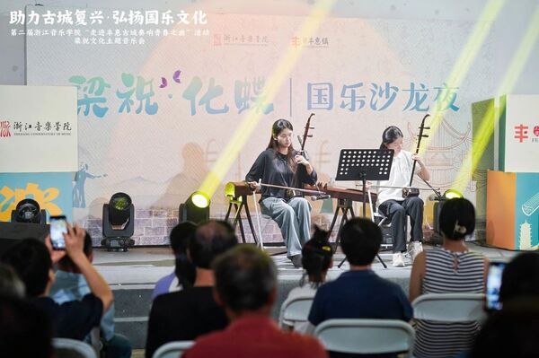 国乐系“文艺轻骑兵”暑期实践团队来到英台故里开展文艺演出活动。“文艺轻骑兵”团队精心策划的文艺晚会,在古戏台上拉开了序幕。《梁祝·十八相送》的经典选段,通过细腻的表演与深情的唱腔,再现了梁祝二人依依惜别的场景,让观众仿佛穿越时空,与古人共情。而二胡协奏曲《梁祝》的演奏,更是将晚会的氛围推向了高潮,丝竹之音,弓弦之韵,交织成一首跨越千年的恋歌,与古城的夜色交相辉映,每一缕乐符都触动着在场每一个人的心弦。
