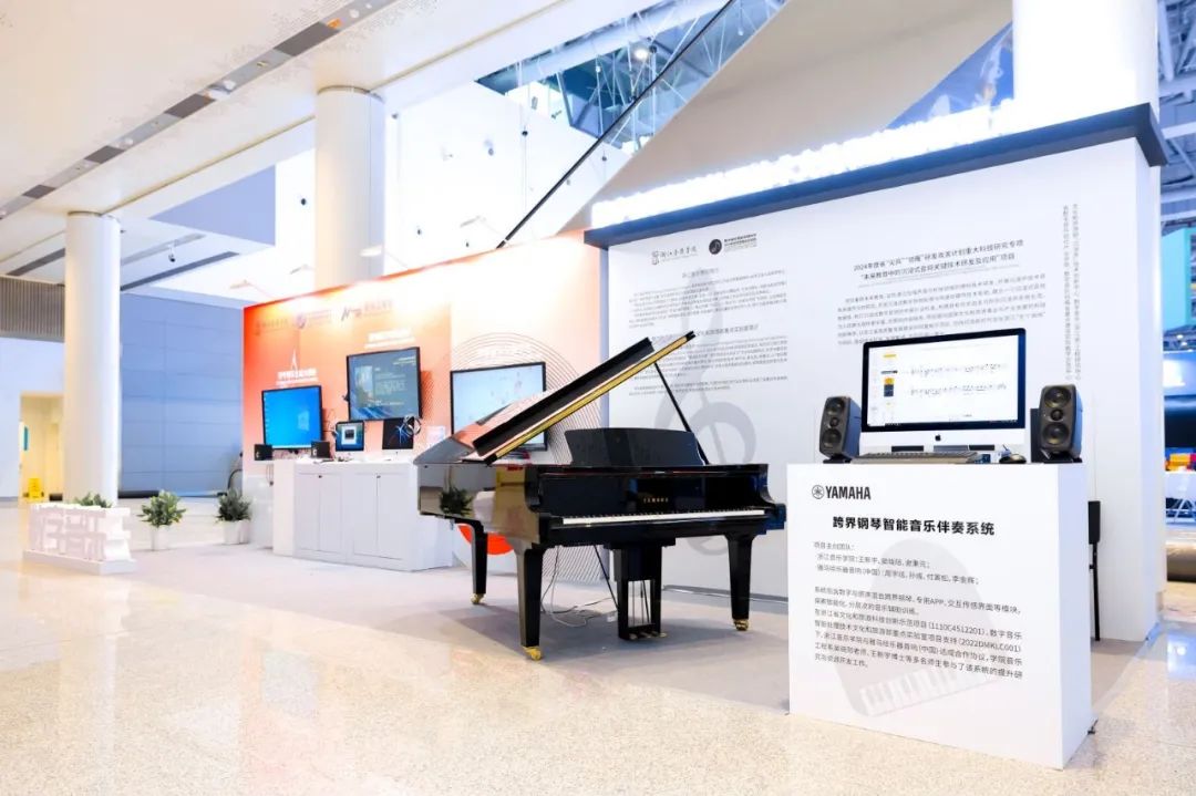 展馆中,一台无人演奏的钢琴吸引了观众的目光。输入乐谱、琴键跃动,仿佛一位隐形演奏家正在现场弹奏,曼妙音乐流淌而出,吸引了不少观众即兴演唱。这是浙音和雅马哈乐器音响中国公司共同研发的跨界钢琴智能音乐伴奏系统,能够解决音乐学习、演奏、娱乐场景中伴奏缺乏的问题。此外,浙音师生还带来符号音乐生成大模型、原创数字音乐展示、数字音乐交易平台等多件展品,具有广泛的应用场景。