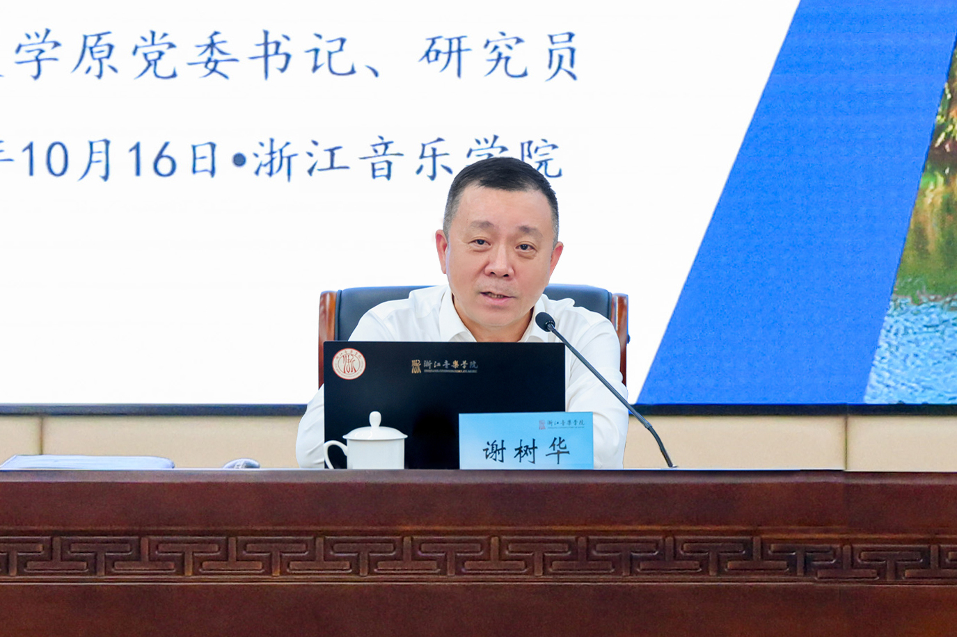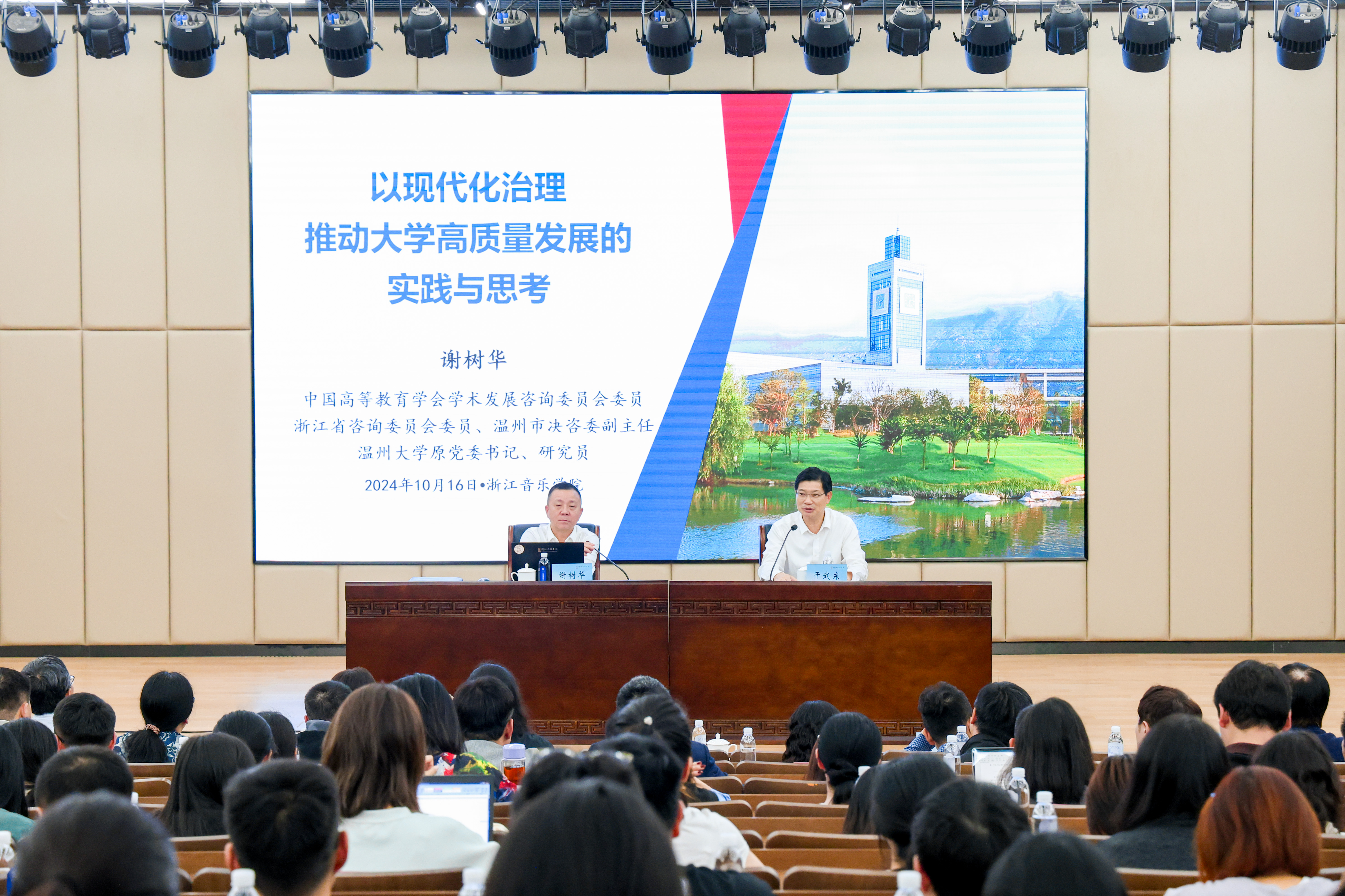 为贯彻落实党的二十届三中全会和省委十五届五次全会精神,进一步全面深化学院改革,推动“高水平一流”音乐学院建设,10月16日下午,学院举办2024年“浙音论坛”报告会,邀请温州大学原党委书记、研究员谢树华作题为“以现代化治理推动大学高质量发展的实践与思考”的报告。学院党政班子成员干武东、蔡亦军、董德君、李波、施莹出席。报告会由党委书记干武东主持。