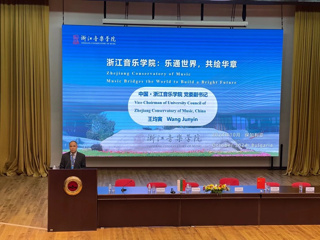 作为艺术类院校的代表,王均寅在发言中特别提到,活动开场索非亚爱格中文学校合唱团为与会嘉宾献上《听我说谢谢你》《你笑起来真好看》等精彩的中文歌曲表演,让大家感受到了友好和温馨。音乐是人类最美妙的语言,能够跨越国界和文化的差异,拉近彼此之间的距离,希望通过此次活动,浙音能与保加利亚相关院校加强深入合作,共同推进全球音乐文化的繁荣发展。