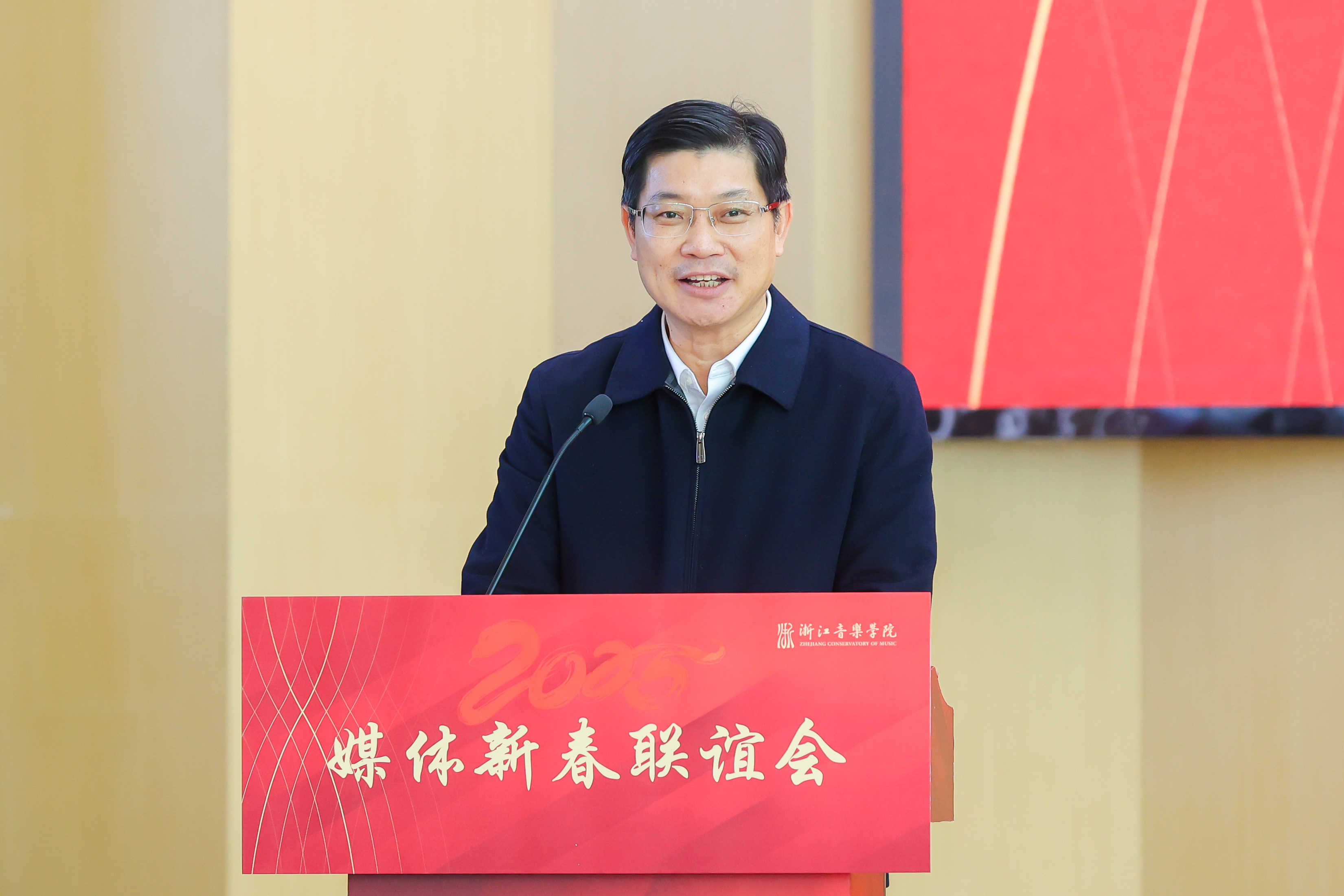 学院党委书记干武东,党委副书记蔡亦军,党委委员、宣传部部长、教师工作部部长施莹,以及新华社、《中国日报》社、中国新闻社、《中国文化报》社、凤凰卫视、抖音集团、《浙江日报》社、浙江卫视、《杭州日报》社的领导、记者出席。蔡亦军主持媒体新春联谊会。
