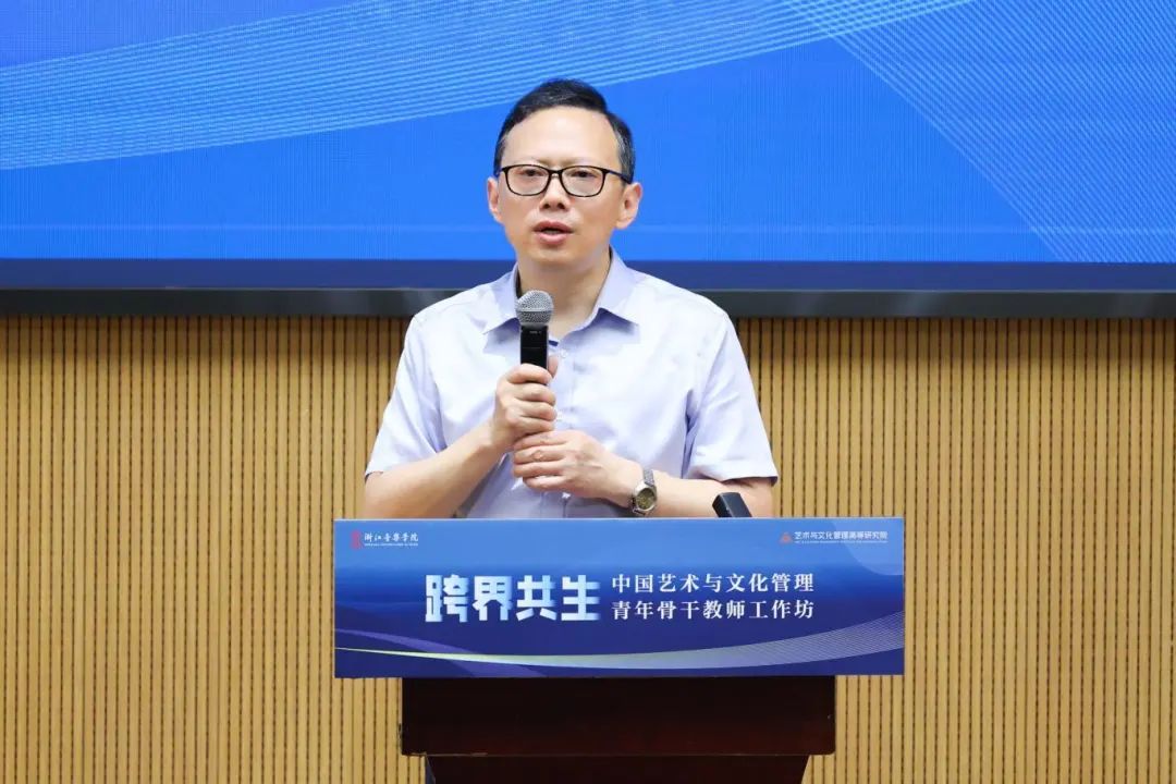 院长王瑞教授致辞。他表示,作为一所成立于新时代的艺术院校,浙音在建校伊始就将艺术管理学科建设纳入发展规划。经过多年理论探索和实践积累,艺术与文化管理高等研究院应运而生。该研究院致力于探索一条创新发展之路:既要培养契合中国文化艺术事业发展需求的高层次管理人才,又要构建集科研合作、社会服务、国际交流和文化智库功能于一体的综合性平台。王瑞立足数智时代的发展语境,深入阐释了工作坊主题“跨界共生”的学理内涵。他指出,在风起云涌的技术革命下,艺术的创作范式、传播形态和产业生态正在发生深刻改变。作为艺术管理从业者,我们既要把握艺术发展的内在规律,更要主动应对时代变革、拓展学科边界,在“跨界共生”中寻求艺术的前进方向。他强调,艺术作为超语义的文化形态,始终承载着人类精神世界的终极关怀。我们要重新建构艺术在当代社会发展中的价值坐标。希望大家能通过本次工作坊,为学科发展和人才培养贡献重要的理论成果与实践智慧,为新时代文化艺术事业注入新的活力。