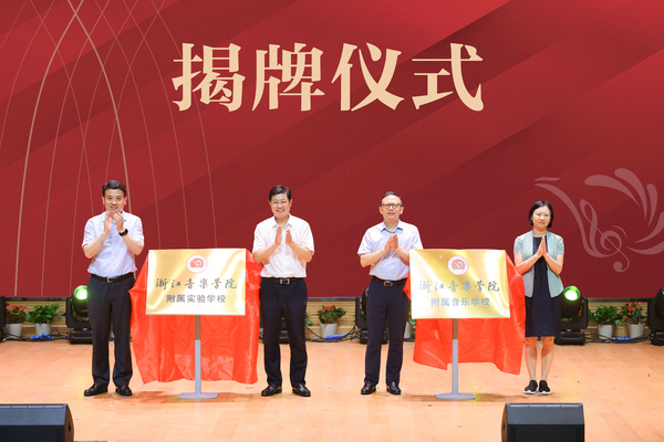 在庄重而热烈的氛围中,干武东、董毓民为浙江音乐学院附属实验学校揭牌;王瑞、周扬为浙江音乐学院附属音乐学校揭牌。