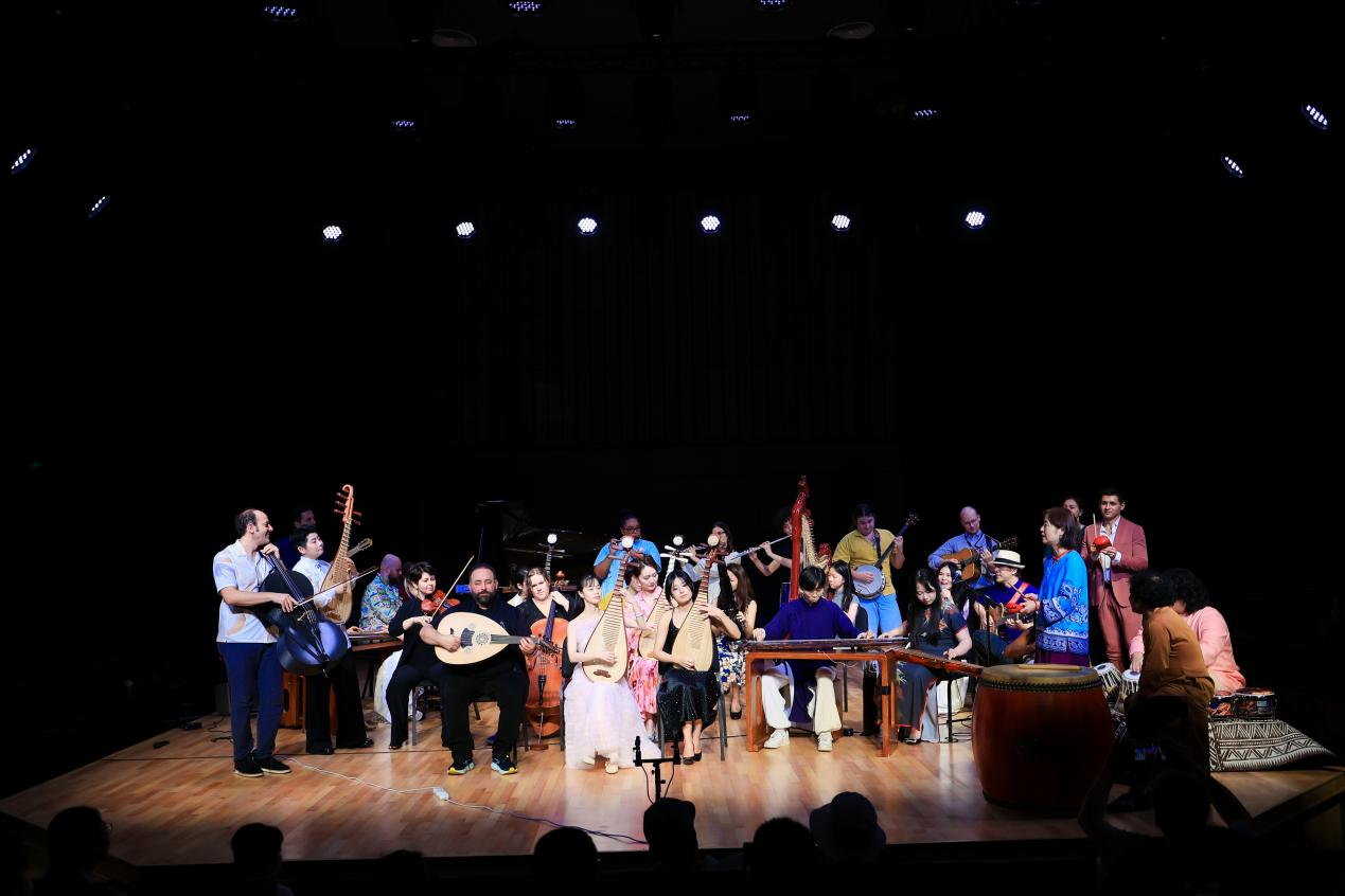首场音乐会由琵琶演奏家吴蛮、塔布拉鼓演奏家Bivakar Choudhury、大提琴家Mike Block、巴西吉他演奏家Ricardo Vogt以及民谣组合小娟&小强联袂演出。音乐会采用线下及线上直播方式进行,线上达万人次观看。整场音乐会,他们演绎了《哈萨克风情》《三十里铺》《Mani Chakra》《巴哈·大提琴无伴奏曲》《Agua De Beber》等10余首作品,涵盖中国民歌、西方古典、拉丁爵士、印度节奏等多种风格,音乐会的压轴曲目《秧歌》,无疑是最令人瞩目的亮点。6位音乐家以各自手中的乐器,分别奏出《秧歌》的旋律主线,在丰富的变奏与即兴交织中逐步推进,最终融为一场欢腾热烈的合奏。现场观众随之击掌应和、气氛火热。整场音乐会在热烈的掌声中圆满收束,不仅展现出艺术完成度,更以动人的方式诠释了“无界音乐”的璀璨内涵。