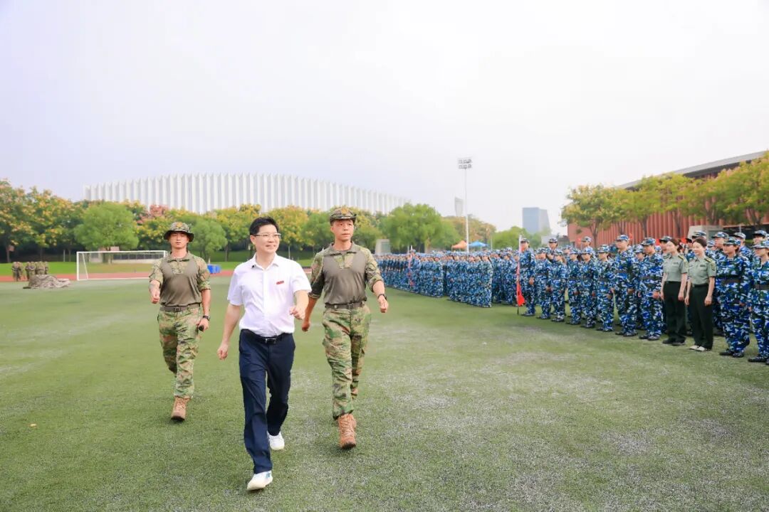 党委书记干武东在军训营营长张超圣的陪同下,逐一检阅代表方阵。