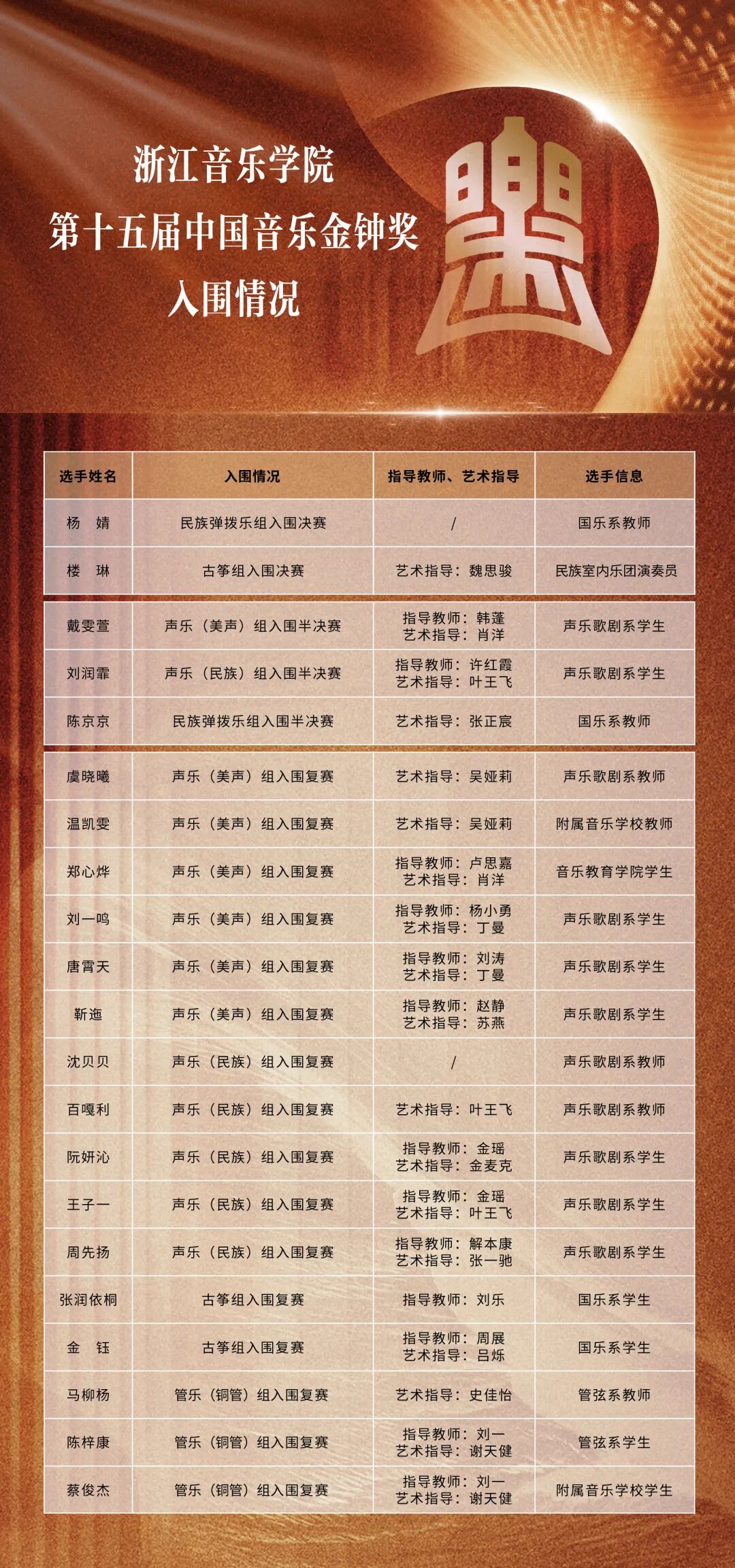 中国音乐金钟奖是由中共中央批准设立、全国唯一常设的音乐综合性大奖,由中国文学艺术界联合会、中国音乐家协会联合主办,每两年举办一届,代表中国音乐各专业领域的最高水平。本届中国音乐金钟奖以“时代金钟・华彩乐章”为主题,决赛阶段比赛于10月18日至29日在成都举行。