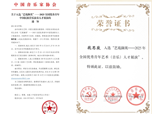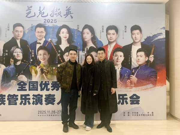 11月27日晚,由中宣部文艺局、中国文联国内联络部、中国音乐家协会共同主办的“艺苑撷英”——2025全国优秀青年中国民族管乐演奏人才展演第二场音乐会在中央音乐学院歌剧音乐厅精彩上演。学院国乐系青年教师魏思骏与7位优秀青年演奏家,联袂指挥家叶聪与中央音乐学院交响乐团,共同呈现了一场兼具艺术性与感染力的民族管乐盛宴。