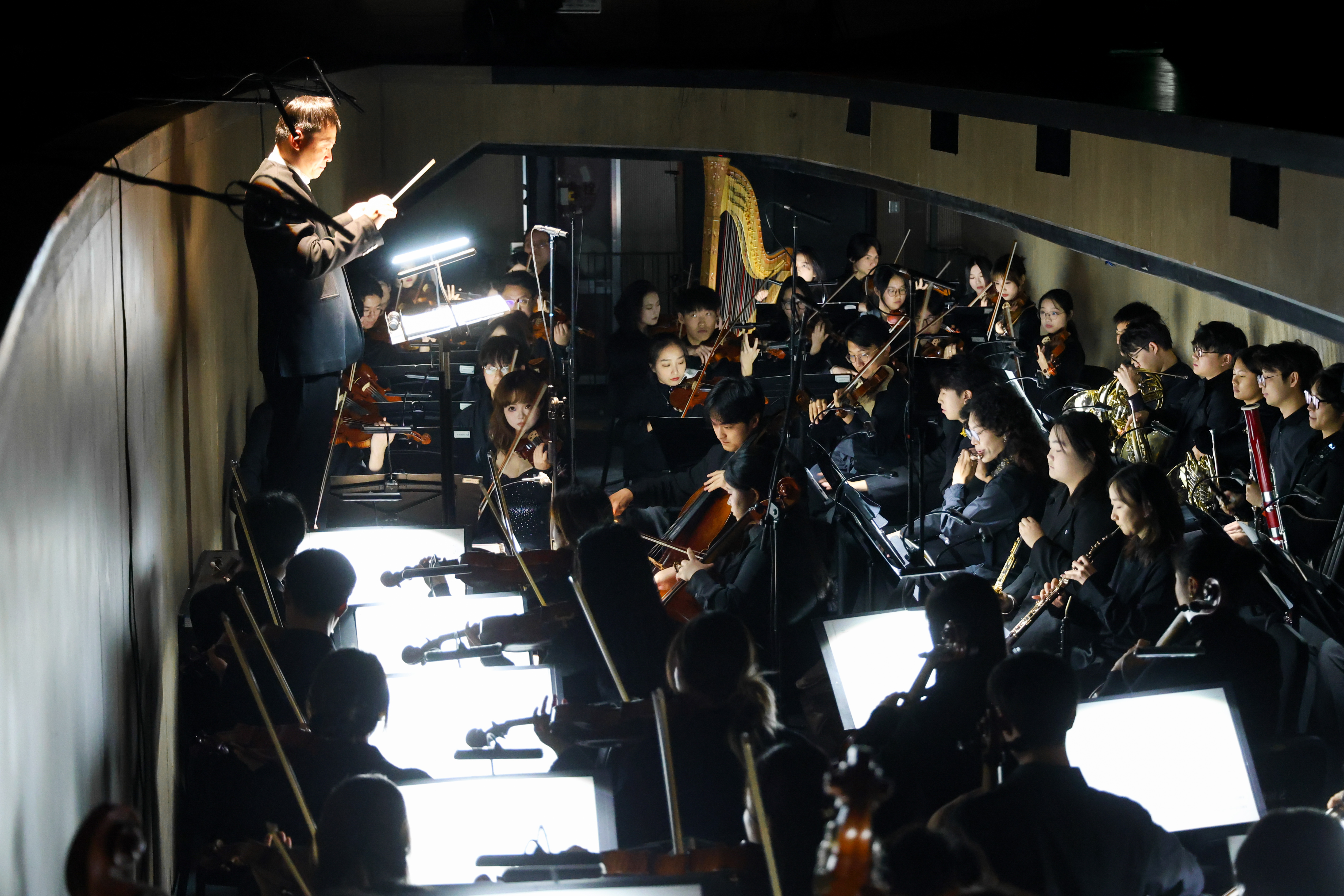音乐会上,交响乐队匠心独运,以音符描绘舞姿。乐队不仅“演奏”音乐,更在“叙述”舞蹈——弦乐的起伏是舞者的呼吸,打击乐的节奏是足尖的落点,管乐的旋律是身体的延伸,乐队用音符绘制舞蹈的轨迹;而舞者也不再是诠释音乐,他们的每一次呼吸、腾跃与静止,都仿佛从交响乐的织体中自然生长而出,成为旋律可视的脉搏。