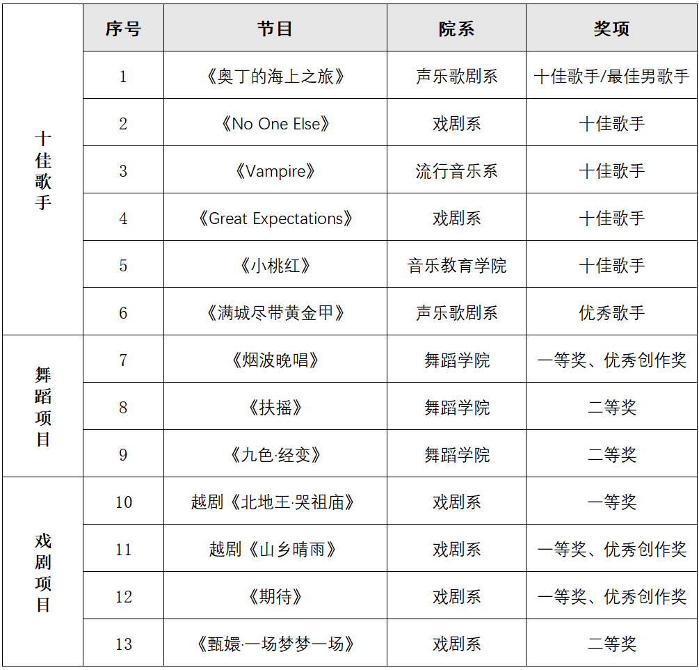 经过前期多轮选拔,学院精心选送“校园十佳歌手”、舞蹈、戏剧三大类共10个节目参加展演(乙组专业组)。在学院师生的共同努力下,经过激烈角逐,最终斩获16个奖项,其中包括校园十佳歌手奖5项、一等奖4项、优秀创作奖3项、二等奖3项、优秀歌手奖1项,同时学院荣获优秀组织奖。“校园十佳歌手”最佳男歌手朱钊涛、“校园十佳歌手”盛阳和舞蹈学院节目《烟波晚唱》在闭幕式晚会上精彩亮相。