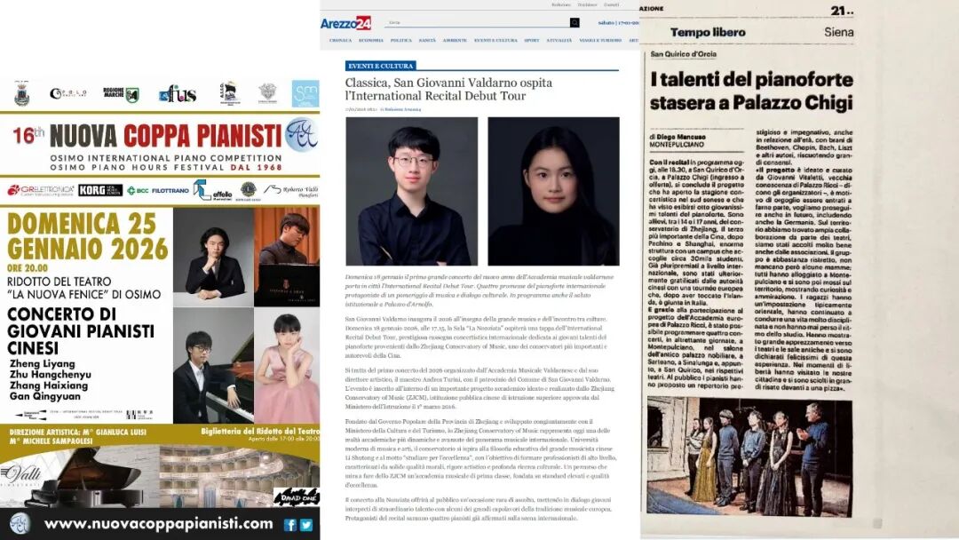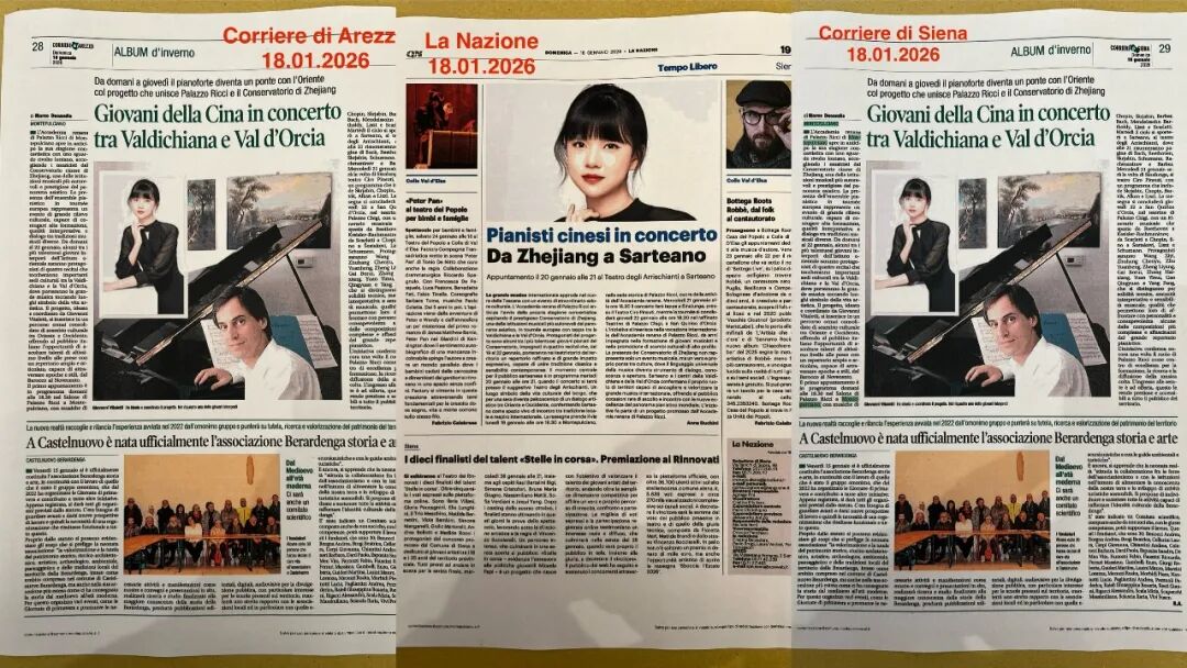 在圣乔瓦尼·瓦尔达诺演出期间,团队受到当地市长瓦伦蒂娜·瓦迪(Valentina Vadi)及文化部门官员的热情接见。双方就中外文化艺术交流展开简短友好交流,市长对浙音学生的演奏水平给予高度认可,并对两地后续文化交流表达了强烈的期待。意大利《La Nazione》《Corriere di Siena》等主流媒体也纷纷聚焦报道,详细介绍了浙音学子的演出情况及现场反响,进一步扩大了此次巡演的影响力。